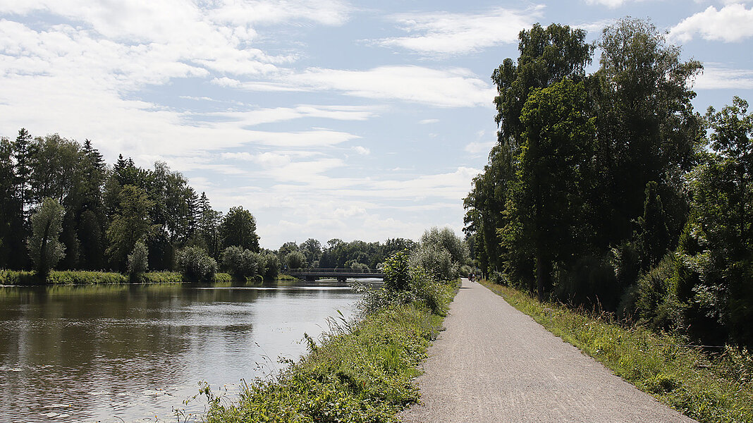 Wer auf dem Radweg bleibt, bemerkt von der Stadt allerdings kaum etwas: Im gesamten Stadtgebiet verläuft die Route durch grüne Flussauen an der Amper oder an kleinen Kanälen entlang, mal durch ein ruhiges Wohngebiet, dann direkt unterhalb des Schlossparks vorbei. Anschließend beginnt einer der schönsten Abschnitte der Tour: Auf einem weitläufigen Radweg geht es an der breiten, aufgestauten Amper entlang, die hier und da von hübschen historischen Wasserkraftwerken überspannt wird.