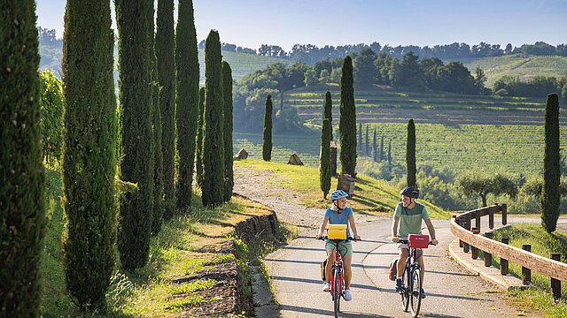 Im Land der Genießer warten auf die Radler dieser „Doppel-Sternfahrt“ malerische Landschaften, guter Wein, kulinarische Leckerbissen und zwei besondere Hotels. Eine historische venezianische Villa in Treviso und ein modernes Familienhotel in Longa Schiavon sind Ausgangspunkte für Radausfüge, z. B. auf der Strada del Vino del Piave und zum Prosecco-Hügel von Valdobbiadene. Auch der mittelalterliche Ort Marostica steht auf dem Programm. Er ist durch ein „lebendes Schachspiel“ bekannt, ein riesiges Schachbrett auf dem Schlossplatz, auf dem ein Spiel mit Menschen nachgestellt wird. 7 Tage, ab 699 Euro.