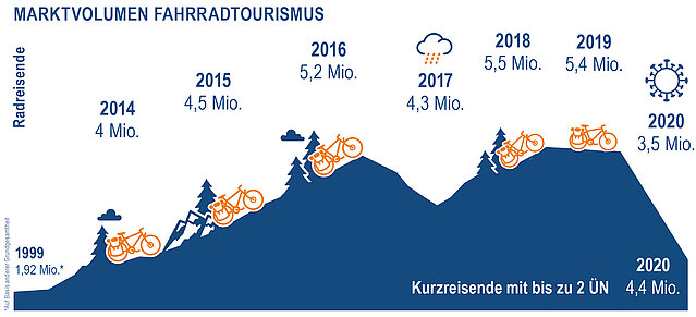 2020 entschieden sich 3,5 Millionen Menschen für eine Radreise, mehr als die Hälfte verbrachte ihren Urlaub das erste Mal auf dem Rad. Zwar verzeichnete der Radtourismus ein Minus von 35 Prozent gegenüber 2019, doch im Vergleich zum Einbruch im Reisebereich generell war dies moderat.
