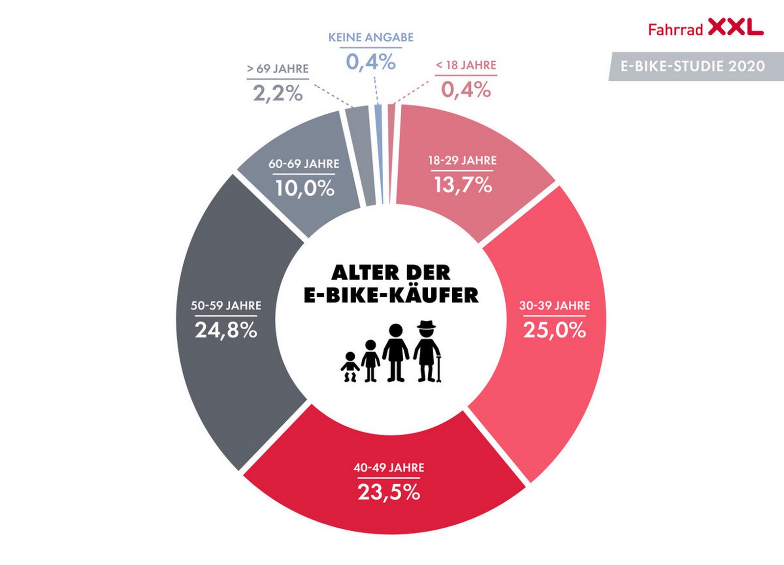 Die E-Bike-Studie 2020 der Fahrrad XXL Gruppe ergab zudem, dass mehr als 80 Prozent der Käufer in einer Partnerschaft leben oder verheiratet sind. Lediglich 13 Prozent der Befragten sind Single.