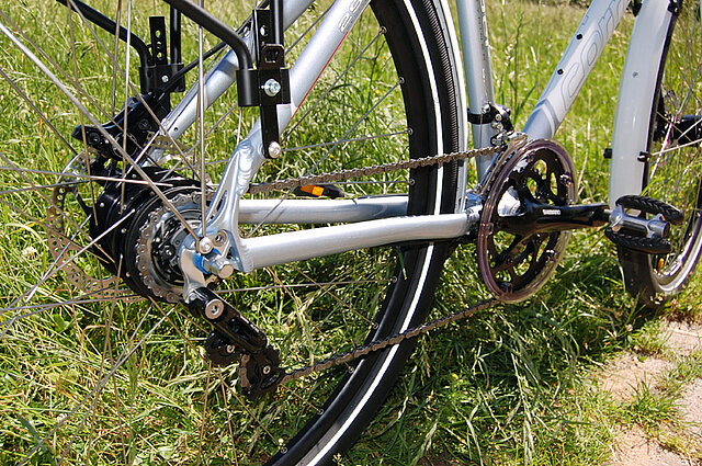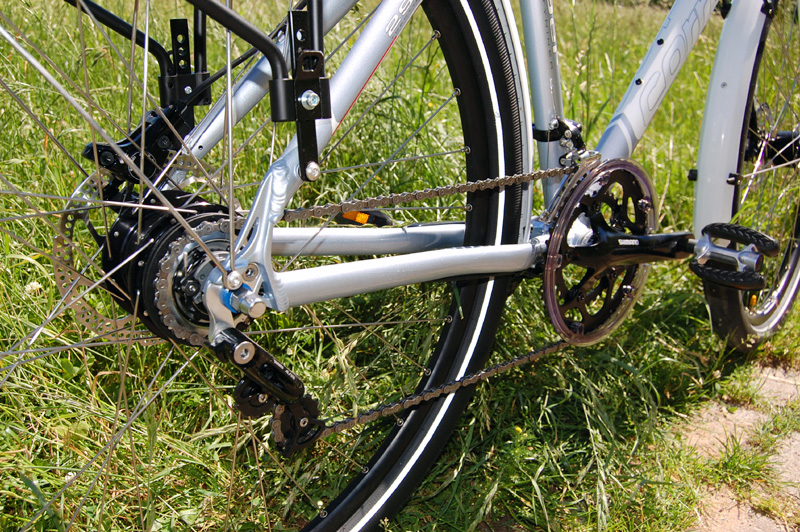 Corratec kombiniert die Alfine-Schaltung (8-Gang-Nabenschaltung) mit zwei Kettenblättern vorne. Die daraus resultierenden 16 Gänge stellen den Radler vor die Frage, ob er für geschmeidiges Treten den vorderen Umwerfer öfter betätigen mag oder lieber im Flachland aus Bequemlichkeit gleich das große Kettenblatt wählt und auf einen leichteren Gang zum Anfahren verzichtet. Für Touren auch mit Gepäck in bergiges Revier ist man mit den kleinen Gängen auf jeden Fall gut vorbereitet. A propos Gepäck - bis 25 kg transportiert der stabile Gepäckträger klaglos.