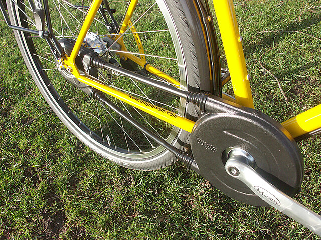Ein weiteres Highlight am Testrad ist der neue Kettenschutz „Country“. Die Kette wird komplett durch zwei elastische PE-Rohre geführt. Schmutzige Kleidung, Quietschen nach Regenfällen und Schlagen der Kette beim Überqueren von Bodenunebenheiten gehören der Vergangenheit an. Die Kette hält wesentlich länger als ohne Kettenschutz.