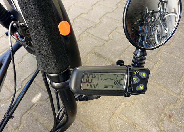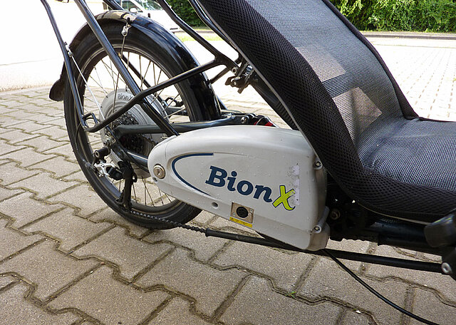 Noch ersetzt die „Stufe 4“ die unausgebildeten Muskeln. Die „Stufe 4“, das ist der maximal zuschaltbare Rückenwind, die Anfahrt- und Bergauffahrhilfe in Form des Elektromotor-Nachrüstsatzes BionX, der unser Test-Trike Scorpion fs der Firma HP Velotechnik ziert. Der Liegerad-erfahrene Tester mag sich gerne mit Stufe 2 zufrieden geben – die unerfahrenen nicht. Dafür nehmen sie dann 6 % Steigung mit gelassenem Lächeln und einem Schnitt von gut 17 km/h – selbstverständlich ginge es sogar noch schneller, dann aber ohne gelassenes Lächeln. Und schaltet man bei dieser Steigung den Motor aus, ziehen bis dahin hinterherhechelnde Aufrechtradfahrer sofort triumphierend vorbei, denn dann wird’s so richtig langsam.
