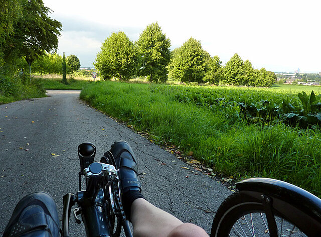 30 cm überm Asphalt gleitet der Allerwerteste dahin. Aug in Aug mit vorbeilaufenden Hunden und knapp überm Auspuff der Autos sieht die Welt des Verkehrsteilnehmers auf dem Liegedreirad doch zunächst sehr ungewöhnlich aus. Spätestens beim ersten Autofahrer, der aus der Seitenstraße kommend erst bremst, als er den munter flatternden Warnwimpel sieht, wird klar, dass man hier besonders vorausschauend fahren muss. Denn die Füße sind bereits 2 Meter vor dem Wimpel unter Umständen in den Aktionsradius des Pkw eingedrungen. Hat man sich diesen Situation vor Augen geführt und seine Fahrweise auf befahrenen Straßen angepasst, bekommt man sehr schnell einen Eindruck vom Fahrspaß, den man – die entsprechend ausgebildeten Muskeln vorausgesetzt – mit dem Trike haben kann.