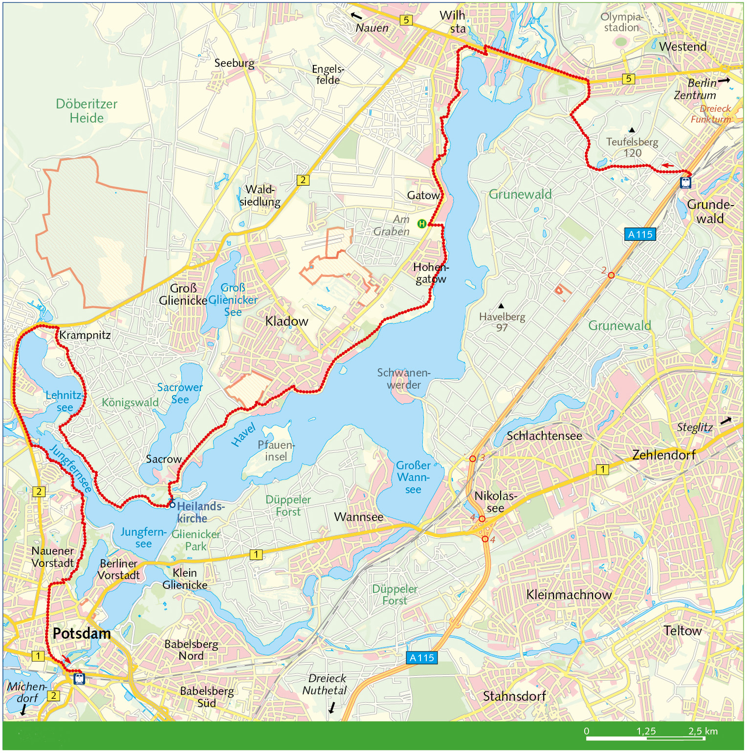 Verlauf: Grunewald – Spandau – Gatow – Kladow – Sacrow – Krampnitz – Neu Fahrland – Potsdam.