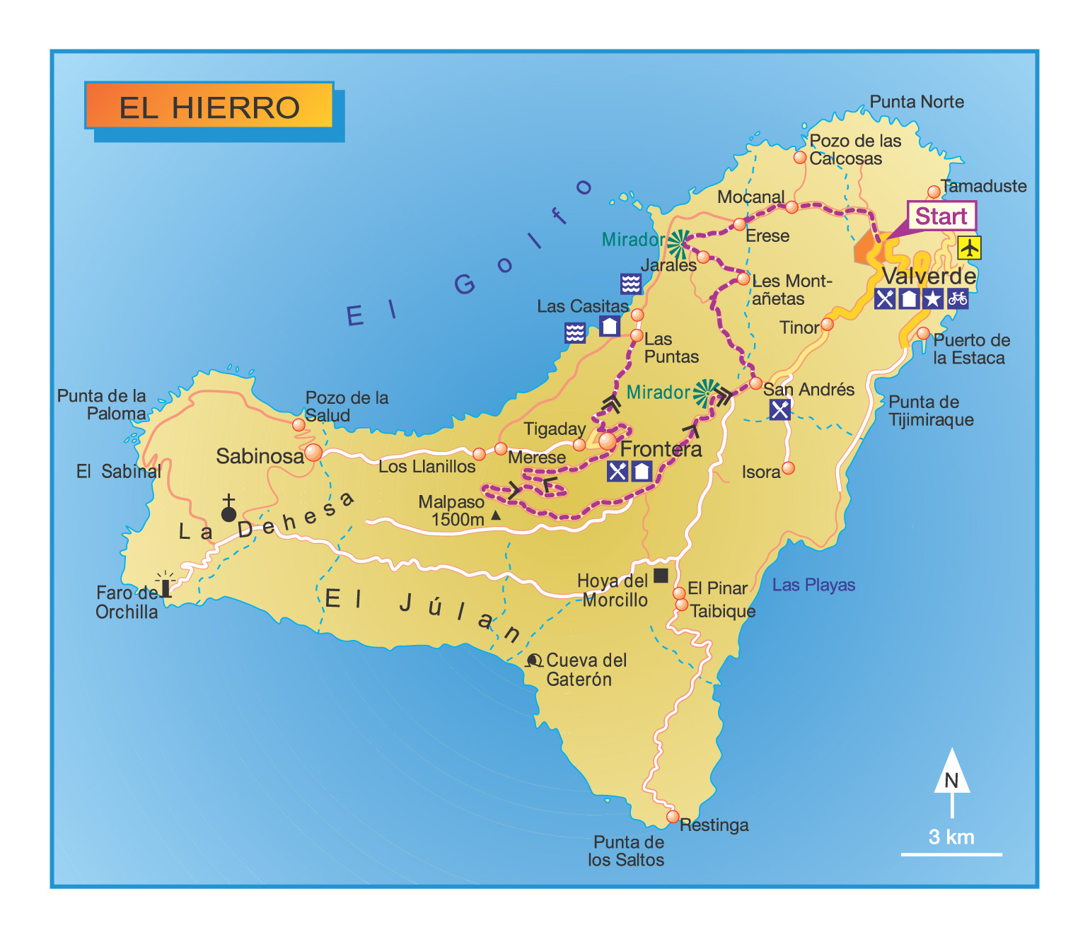 Streckenverlauf: Valverde – Mocanal 4 Kilometer – Mirador de la Peña 5 Kilometer – Las Montañetas 2 Kilometer – San Andres 5 Kilometer – Frontera 21 Kilometer – Las Puntas 9 Kilometer