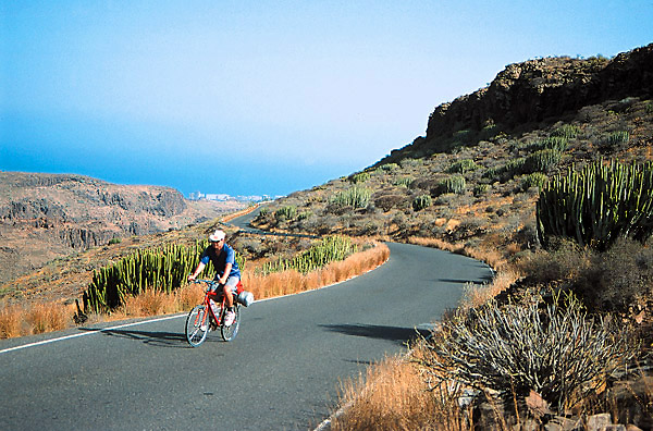 Doch die Mühen lohnen sich: Wir überqueren die Insel fast exakt in der Mitte von Süd nach Nord, fahren durch ein mit großartigen Felswänden durchsetztes Gebirge und genießen eine wahrhaft traumhafte Abfahrt nach Agaete. Und der Streckenabschnitt an der ebenfalls sehr gebirgigen Westküste zählt zum Schönsten, was die Kanarischen Inseln zu bieten haben: den unglaublichen Wechsel aus schroffer Steilküste und fruchtbaren Tälern. Bei einer sinnvollen Einteilung der Kräfte – vor allem der erste lange Berganstieg läßt sich gut in zwei Etappen aufteilen – wird diese Rundfahrt zu einem unvergesslichen Erlebnis. Start- und Zielort ist das Ferien-Dorado Playa del Inglés am südlichsten Punkt der Insel, dort, wo es sich wunderbar ausspannen und Kräfte bündeln lässt.