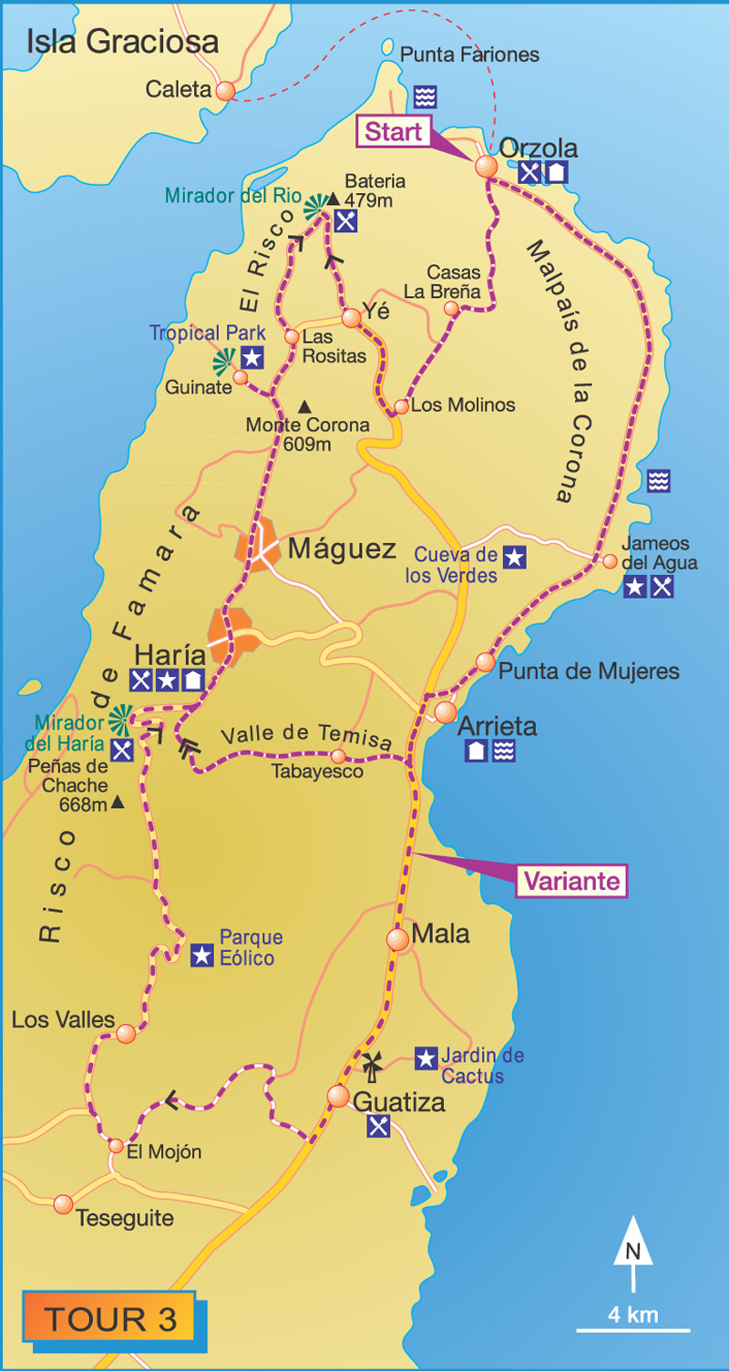 Besonderheiten: Ganzjährig zu empfehlen. Möglichst früher Aufbruch vorteilhaft, da sich am grandiosen Aussichtspunkt Mirador del Rio im Tagesverlauf gelegentlich Wolken festhängen. An besonders heißen Tagen empfiehlt sich die Strecke in umgekehrter Richtung zu fahren.
