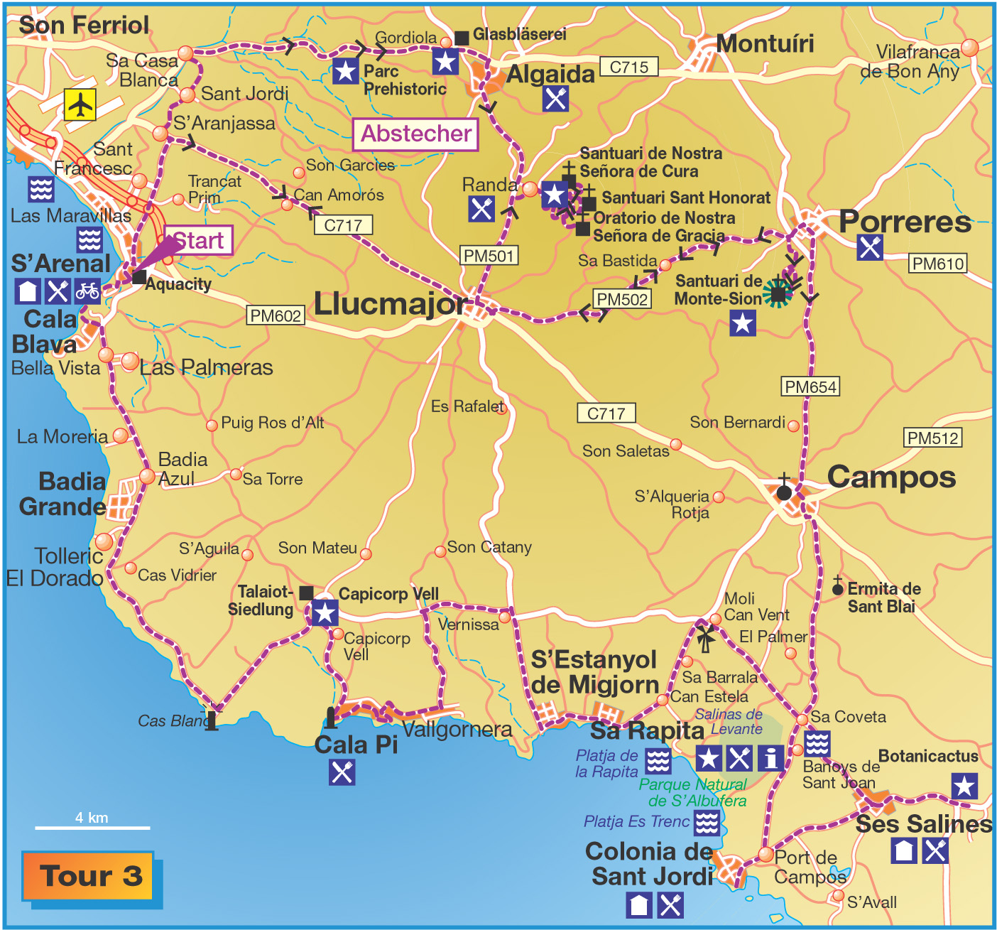 Streckenverlauf: Aqualand – Richtung Cala Blava am Meer entlang (5 km) – Cala Blava – Bella Vista – Cap de Regana (9,5 km), dann zum Cap Blanc (6,5 km) – Cala Pi (4 km) – Vallgornera (4 km) – links 3,5 km – rechts nach Vernisa (3 km) – rechts nach S’Estanyol de Migjorn (4,5 km), weiter nach Sa Rapita (3 km), auf der PM 603 bis zur größeren Kreuzung (3,5 km), dann rechts Richtung Ses Salines (4,5 km). In Sa Coveta Richtung Colonia de Sant Jordi 6 km (auf halbem Weg Nationalpark Es Trenc), in Colonia de Sant Jordi an der Weggabelung (nach dem Besuch des Hafens) auf dem Rückweg rechts nach Ses Salines, weiter 500 m hinter Ortsausgang bis zum Garten Botanicactus, auf gleicher Straße wieder zurück bis Ses Salines (2,5 km) dort rechts halten. 4 km bis Sa Coveta, dort rechts auf der PM 654, 5 km nach Porreres (Abstecher zum Santuari de Monti-Sion: 5 km). Von Porreres auf der PM 502 12 km nach Llucmayor, auf der C 7175 14 km bis S’Aranjassa, links 4 km bis S’Arenal