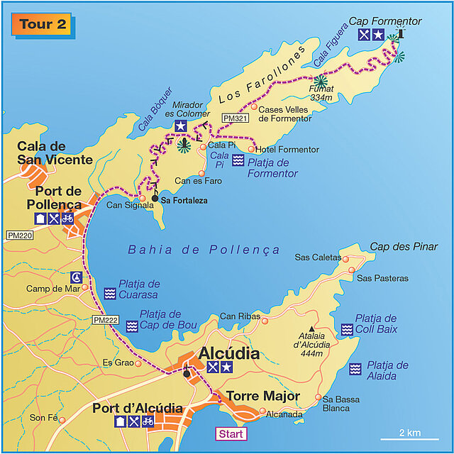 Streckenverlauf: Port d'Alcúdia - Alcúdia - Richtung Port de Pollença 8 Kilometer - Strandpromenade 2 Kilometer - Cala Pi 6 Kilometer - Cala Figuera 7 Kilometer - Cap de Formentor und zurück - Küstenstraße Can Picafort - Port d'Alcúdia