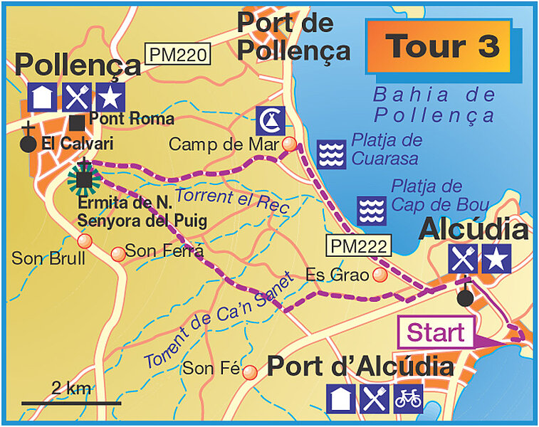Streckenverlauf: Port d’Alcúdia – Richtung Port de Pollença (4 Kilometer) – links beim Camp de Mar – Richtung Pollença (5 Kilometer). Zurück: Umgehungsstraße Richtung Palma – Abzweig links Richtung Alcúdia – nach 6 Kilometer links – dann am Ende des Weges rechts Richtung Alcúdia – von dort 2,5 Kilometer nach Port d’Alcúdia