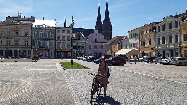 Nun geht es wieder ostwärts. Hinter Čáslav wird die Landschaft hügeliger, und wenn man die großen Straßen umgehen möchte, lassen sich einige Bögen und Steigungen nicht vermeiden. Dafür findet man sich unversehens in einer Hochebene mit Kuhweiden und winzigen Dörfern wieder, die ein bisschen an die Pyrenäen erinnert. In Heřmanův Městec kann man einen Übernachtsstopp machen, anschließend radelt man durch sanft gewellte Landschaft und an kleinen Flussläufen entlang nach Vysoké Mýto – ein willkommener Zwischenstopp. Wie in vielen tschechischen Kleinstädten liegt im Zentrum der weitläufige, rechteckige Hauptplatz. In der Mitte ragt die kunstvoll verzierte Mariensäule in die Höhe, rumdherum reihen sich hübsche Häuser, Kirchen und das Rathaus. Hier findet man garantiert eine Auswahl an Eisdielen und Cafés mit leckeren tschechischen Kuchen, Mohn- und Quarktaschen.
