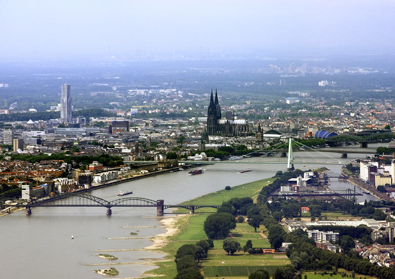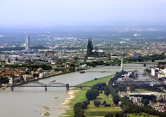Im Grunde kann man hier von zwei Radwegen sprechen: Dank zahlreicher Brücken und Fähren lassen sich beide Seiten des Rheins abwechselnd erradeln, und der Reisende hat die Qual der Wahl. Von Neuss her kommend lohnt ein Stopp in der gut erhaltenen Mittelalterstadt Zons, deren historische Altstadt unbedingt einen Besuch lohnt. Bald darauf ist Köln erreicht. Linksrheinisch radelt man bequem und autofrei über die Promenade bis zur Domplatte. Abstecher führen zu den wichtigsten Sehenswürdigkeiten wie beispielsweise dem Kölner Dom. Die Besichtigung der gewaltigen gotischen Kathedrale ist für Köln-Besucher ein absolutes Muss. Weitere Highlights sind Museen von Weltrang, die zwölf romanischen Kirchen und nicht zuletzt die vielen, oft typisch kölschen Einkehr-Möglichkeiten. Ein Gläschen Kölsch kann auch Radlern nicht schaden! Auf der rechten Rheinseite lädt der über 40 Hektar große Rheinpark zum Verweilen ein. Die preisgekrönte Grünanlage ist zur Bundesgartenschau 1957 entstanden und Standort der Kölner Rhein-Seilbahn, von wo aus man einen einzigartigen Blick auf das Kölner Rheinpanorama genießen kann.